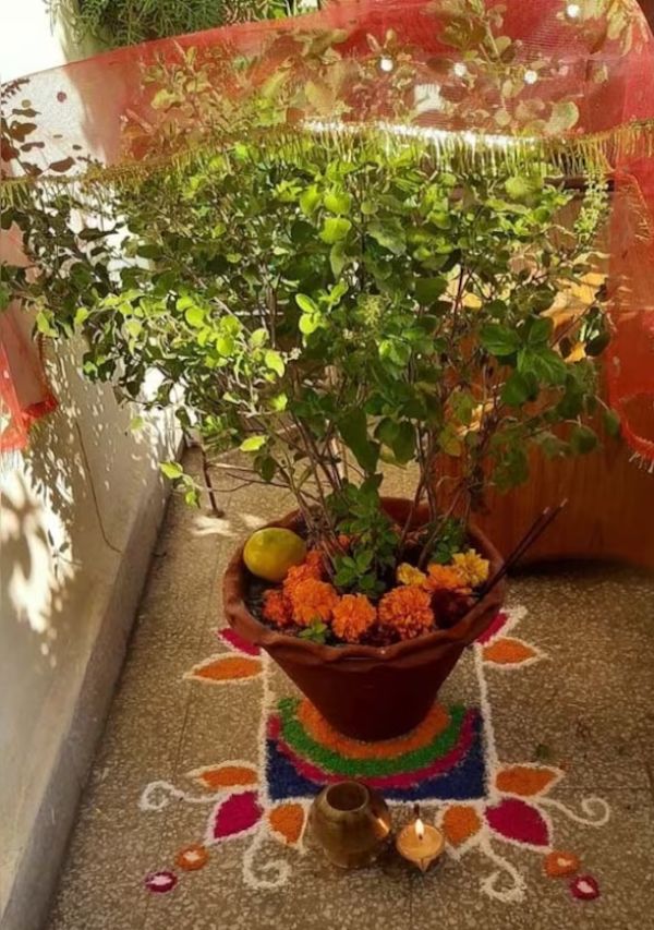 तुलसी माता को साड़ी और लाल चुनरी पहनाएं, सुहाग का सामान अर्पित करें, सिंदूर लगाएं और अच्छे से श्रृंगार करें.